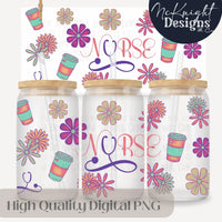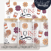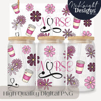 Nurse | Coffee, Floral & Stethoscope Glass Can Wrap PNG | 16 oz Cup Digital Design Sublimation & UVDTF