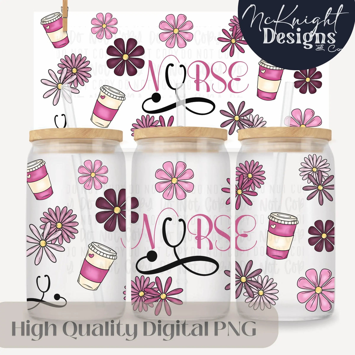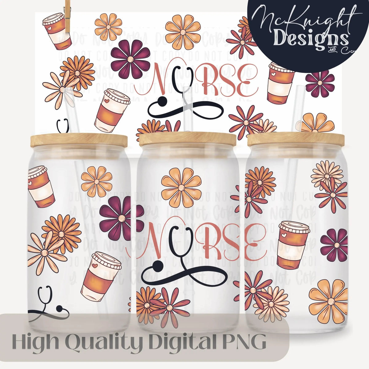 nurse glass can wrap with coffee cups, florals, and a stethoscope — ideal for sublimation or uvdtf on 16 oz Libbey-style cups!