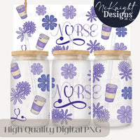 This high-resolution PNG features a violet and lavender floral design with cute coffee cups and a stethoscope wrapped into the word “Nurse.” Designed for 16 oz glass cans and compatible with sublimation or uvdtf transfer printing.