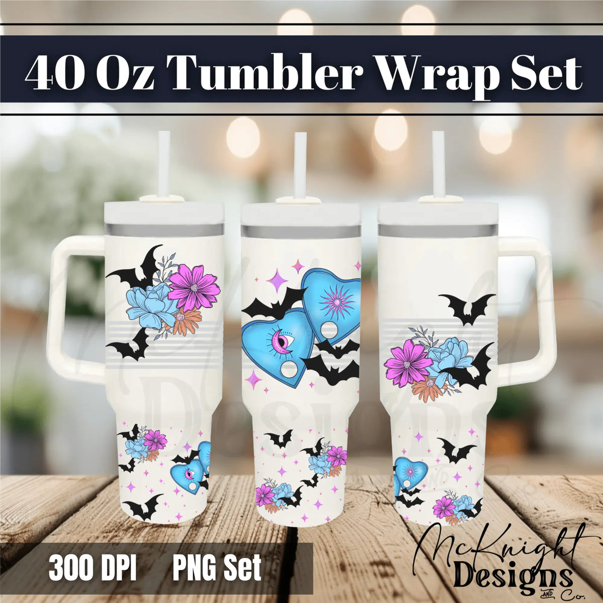 ✨ High-Quality PNG Digital File for UVDTF & Sublimation – Spooky Planchette 40 oz Tumbler Wrap Featuring Bats, Floral Accents & Mystical Elements in Pink & Blue (2-Piece Straight Wrap for Stanley & Simply Modern Cups)! ✨