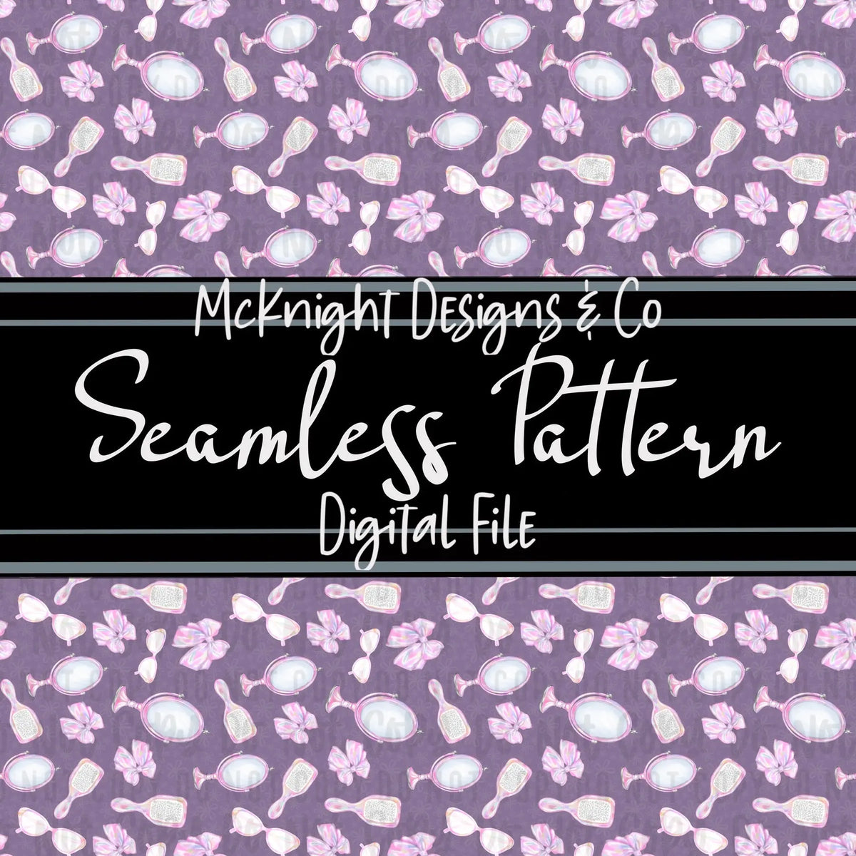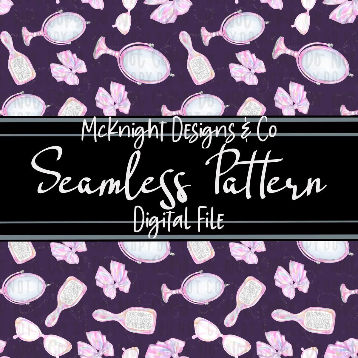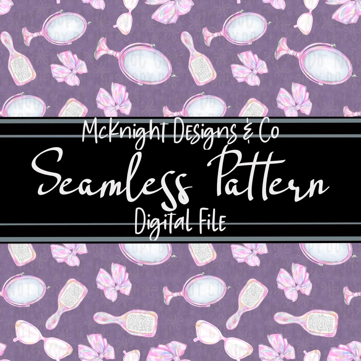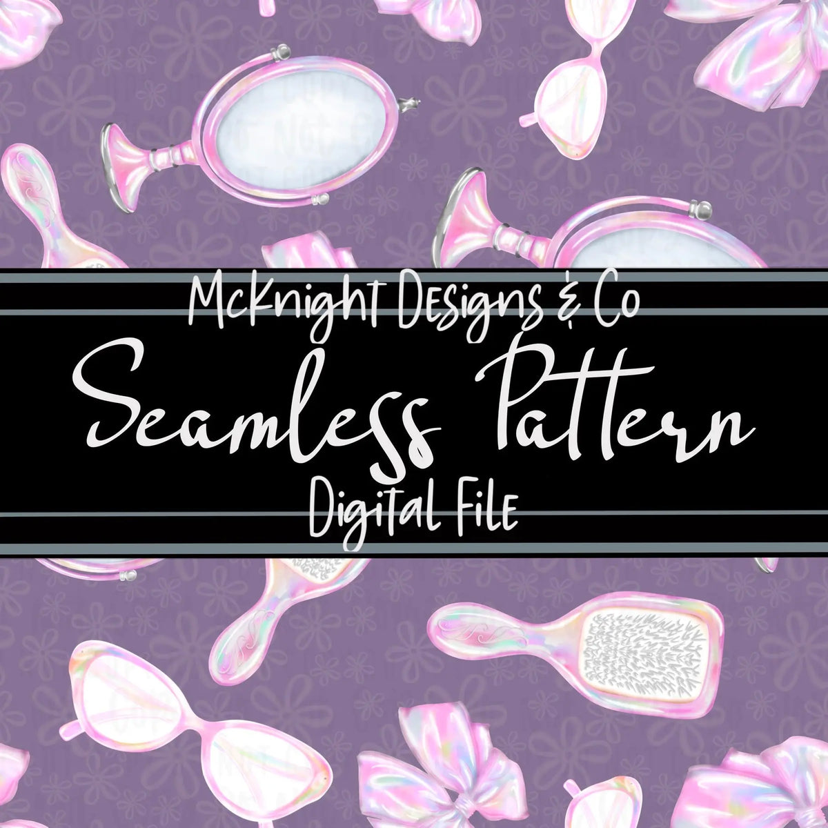 Iridescent Girly Seamless Pattern – Hand-Drawn Mirrors, Brushes & Bows - Digital Design for Fabric, Vinyl & Sublimation