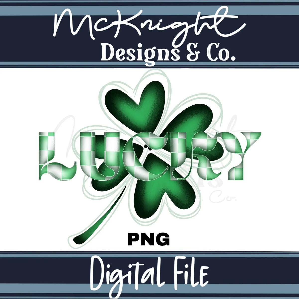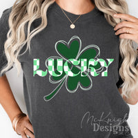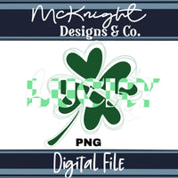 Celebrate the Irish spirit with this Lucky PNG design, featuring bold hand-lettered typography over a classic four-leaf clover with trendy green & white checkered print. It's perfect for creating fun and festive St. Patrick’s Day shirts, drinkware, or custom merch.